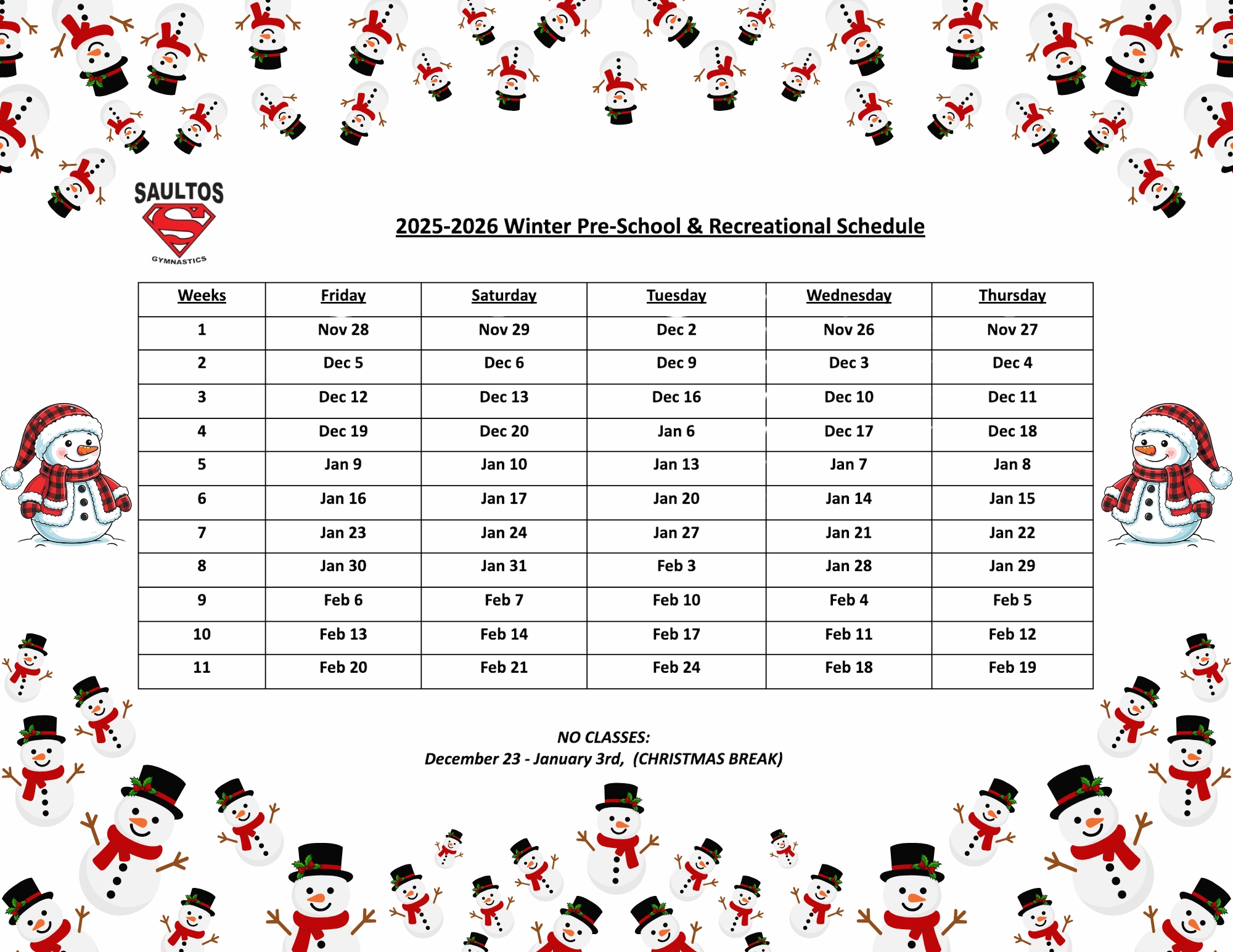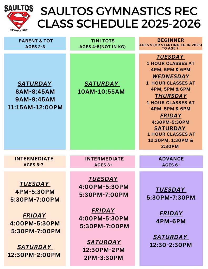 Refund Policy: Refunds will not be processed after week 2 of any session without a medical note. Refunds are for class fees only and there is a $30 administration fee for all refunds. Saultos reserves the right to cancel classes if the minimum numbers are not met. If a class is cancelled due to low enrolment we will place you in a different class, If space is not available in a different class, a full refund will be issued.